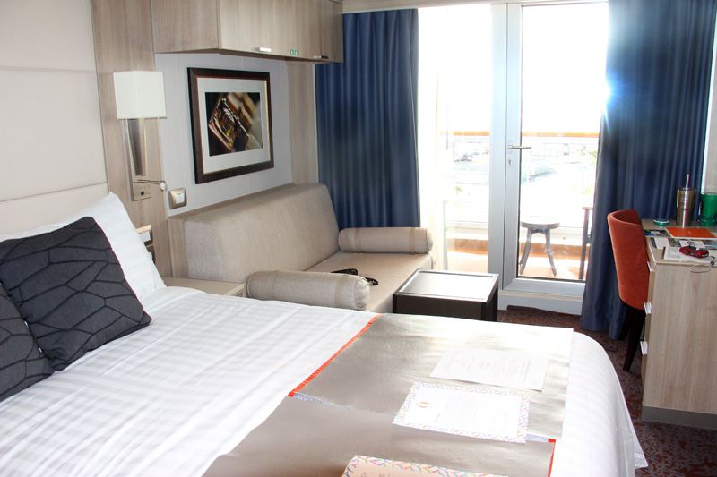 Our cabin this cruise was on the Navigator level (8), room 8065---mid-ship on the right side (I know I should say starboard or port or whatever, but I'm not that nautical minded). I had reserved a VF (lowest level of unobstructed verandahs) for $899@ and hoped that we weren't given a cabin with the solid metal wall on the varandah. We usually get upsell offers, but didn't get any for this cruise. Probably just as well, we were pretty happy where we ended up. About 10 days before the cruise, I was happy when we got the email saying that we got a VA---highest level of verandahs (not including the spa verandahs). I was kind of hoping for the VQ spa verandah like we had last year, but figured this ought to be really good, too.