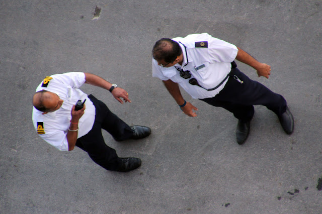 Pretty soon it was time to go to the observation deck to watch sail away and sunset. The ship was already throwing a shadow over the port.